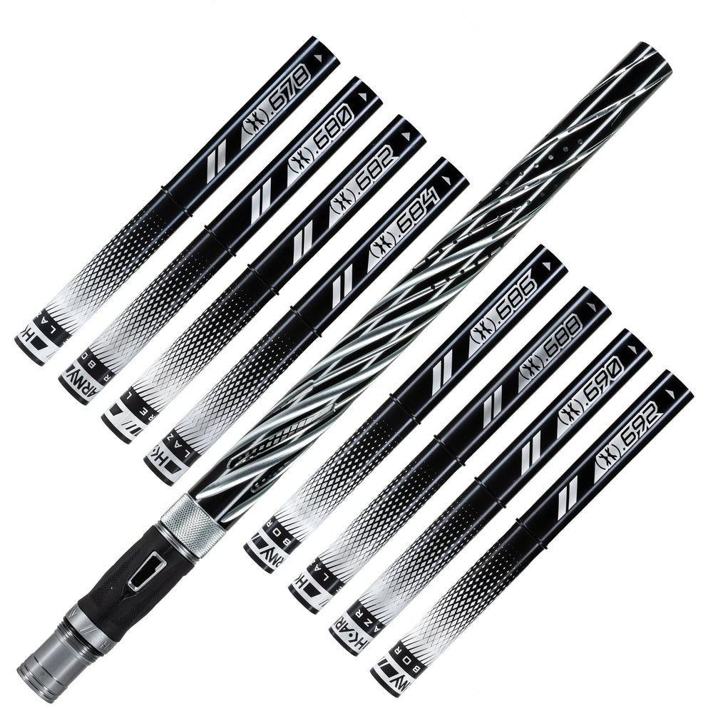 The LAZR Elite "Orbit" Barrel Kit comes complete with 8 Barrel Bore Inserts, an Elite Barrel Tip, Bore Sizer and 4 interchangeable Accent Grips. The LAZR Elite Barrel Kit is packaged with an HK Army EXO Barrel Protective Case.