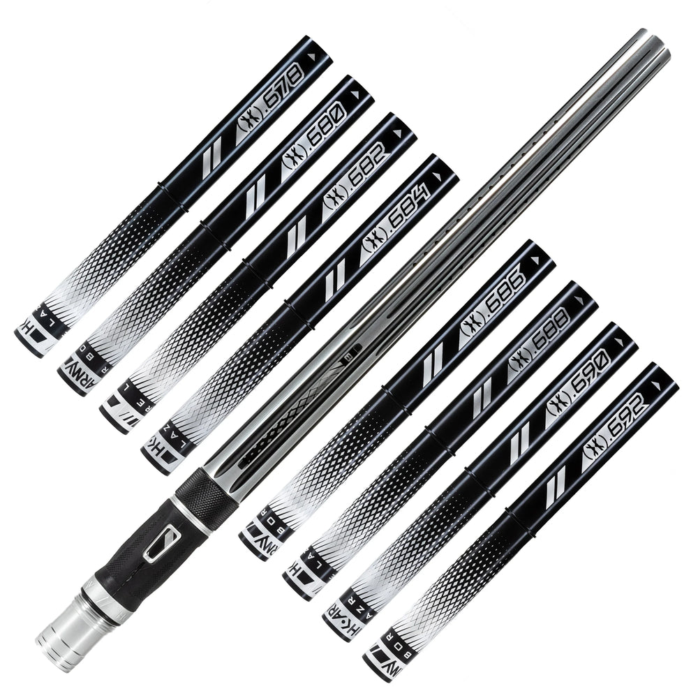 Featuring exterior-precision milling, the "Nova" LAZR Elite Barrel Kit makes a stellar enhancement to your marker aesthetic while delivering ball-on-ball accuracy and reduced sound signature. With 8 bore inserts to choose from, simply size your paintballs with the included bore sizer and slide the perfectly matched bore insert into the barrel back.