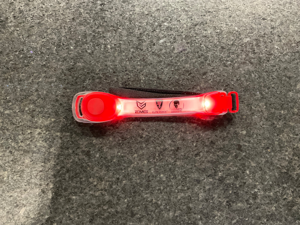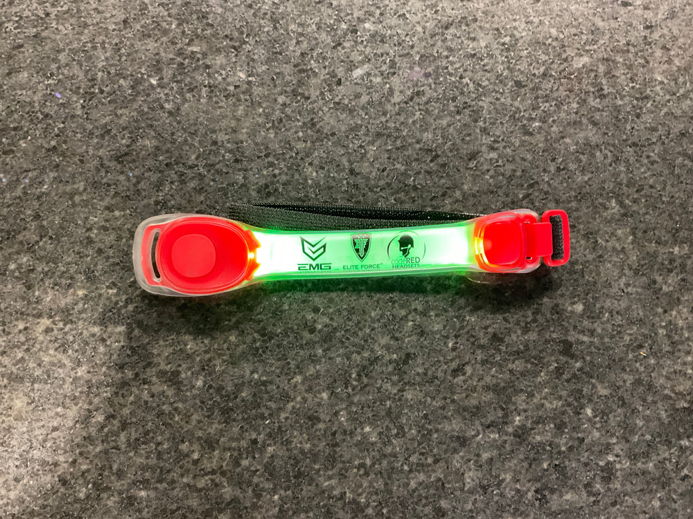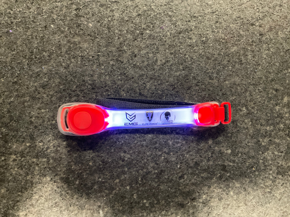 The EMG IFF LED Arm Band was developed as an additional aid to help fields and players to differentiate teams by color to quickly identify allies and opposing forces. The arm band features a convenient toggle switch which cycles through 4 different LED colors (Red, Green, Blue, and Magenta). The Arm Band is easy to put on and is comfortable to wear with its soft flexible pvc rubber and elastic hook & loop construction. Additionally, the Arm Band can be used as a high visibility "dead rag" with the red LED function to notify other players.